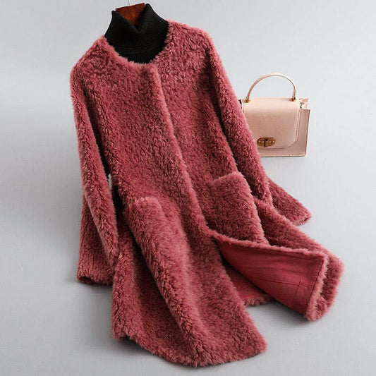 Women’s Faux Shearling Mid-Length Coat with Round Neckline